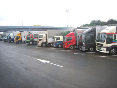もう直ぐ京都 夜明けのサービスエリアに並んだ貨物車の列