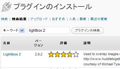 プラグイン → 新規作成 →検索のところに lightbox 2 → プラグインの検索