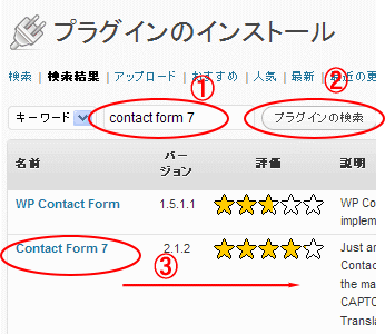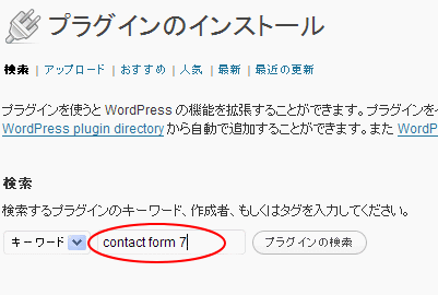 上記では contactform7と入れました。 コレは「お問い合わせフォーム」を作るプラグイン