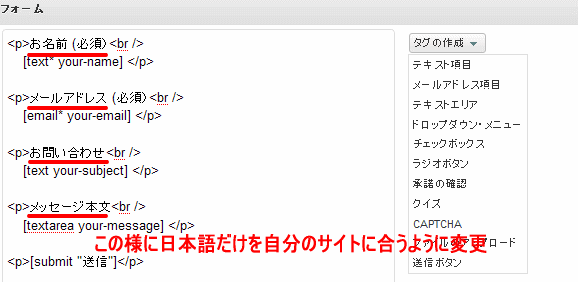 ここをクリック お問い合わせフォームの編集をする 日本語に為っている所のみ